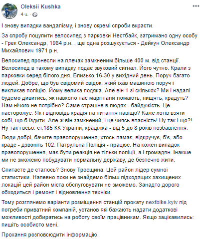 Как написал в соцсети основатель украинской сети проката Veliki и Nextbike Алексей Кушка, велосипеды воруют днем, несмотря на то, что пункты проката расположены в людных местах.