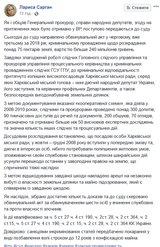 "Досудебным расследованием установлено, что должностные лица Харьковского городского совета, в октябре - декабре 2008 года вступили в предварительный сговор и, действуя в интересах лиц, которые якобы нуждались в улучшении жилищных условий, злоупотребляя своим служебным положением, путем мошеннических действий устранили препятствия последнему в завладении правом на землю, что повлекло тяжкие последствия. С целью возмещения причиненного ущерба наложен арест на незаконно выбывшие из собственности земельные участки и имущество подозреваемых, который является соразмерным с причиненным ущербом", - написала Лариса Сарган.
