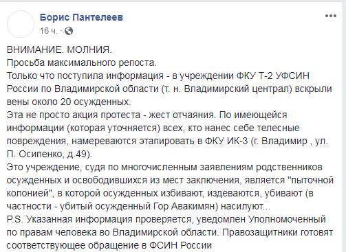 По его словам, это "жест отчаяния заключенных, который связан с нежеланием отбывать срок в ИК-3, которую в регионе называют "пыточной колонией". "Это учреждение, судя по многочисленным заявлениям родственников осужденных и освободившихся из мест заключения, является "пыточной колонией", в которой осужденных избивают, издеваются, убивают, насилуют…", - написал он. Пантелеев добавил, что уведомил об этом уполномоченного по правам человека во Владимирской области.