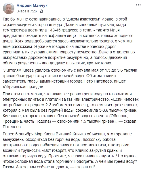 Журналист Андрей Манчук прокомментировал заявление городских властей в Facebook. "Где бы мы не останавливались в "диком азиатском" Иране, в этой стране везде есть горячая вода. Даже в сплошной пустыне, когда температура достигала +43-45 градусов в тени, - так что Илья предлагал пожарить на асфальте яйцо - и хотелось только холодного душа. Хотя вода добывается здесь исключительно тяжело, о чем мы еще расскажем. Я уже не говорю о качестве иранских дорог - сравнивать их с украинскими попросту неуместно. Даже в отдаленных шахрестанах дорожное покрытие безупречно, а полосы движения обычно разделены - иногда даже в высоких, крутых горах", - рассказал он.