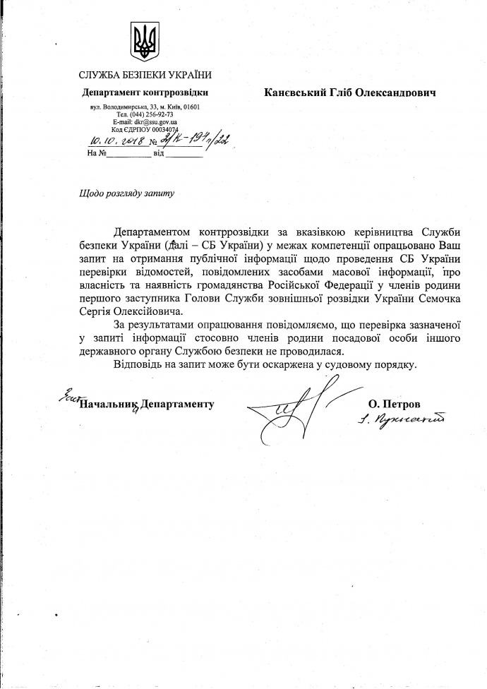 СБУ не проводила проверку обнародованной журналистами информации о том, что первый заместитель председателя СВР Сергей Семочко имеет дорогую недвижимость, а его родственники - российское гражданство. Об этом со ссылкой на данные главы экспертной организации StateWatch Глеба Каневского пишет "Украинская Правда".
