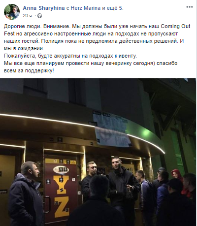 Вечером в четверг, 11 октября, в харьковскоком Art Club Yellow Zeppelin представители националистической организации Фрайкор заблокировали проведение мероприятия Coming Out Fest в поддержку ЛГБТ-сообщества.