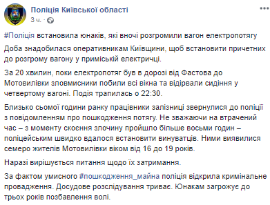 "За 20 минут, пока электропоезд был в пути от Фастова до Мотовиловки, злоумышленники побили все окна и оторвали сиденья в четвертом вагоне. Инцидент произошел в 22:30. Около 07:00 работники железной дороги обратились в полицию с сообщением о повреждении поезда. Несмотря на потерянное время (с момента совершения преступления прошло более восьми часов), полицейским быстро удалось установить виновников. Ими оказались семь жителей Мотовиловки в возрасте от 16 до 19 лет", - указывают правоохранители.
