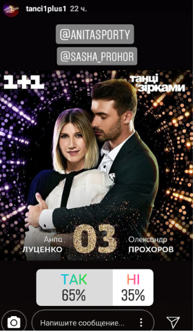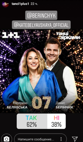 В Instagram-аккаунте шоу пользователям предложили предварительно проголосовать за любимую пару. Пока что лидируют Денис Беринчик и Катерина Белявская – 62% "за" и 38% "против", а также Анита Луценко и Александр Прохоров – 65% "за" и 35% "против".