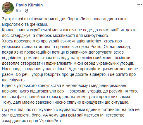 Украинские дипломаты должны встречаться с представителями венгерских общин, чтобы бороться с пропагандистской мифологией и фейками. Об этом в Facebook сообщил министр иностранных дел Украины Павел Климкин.