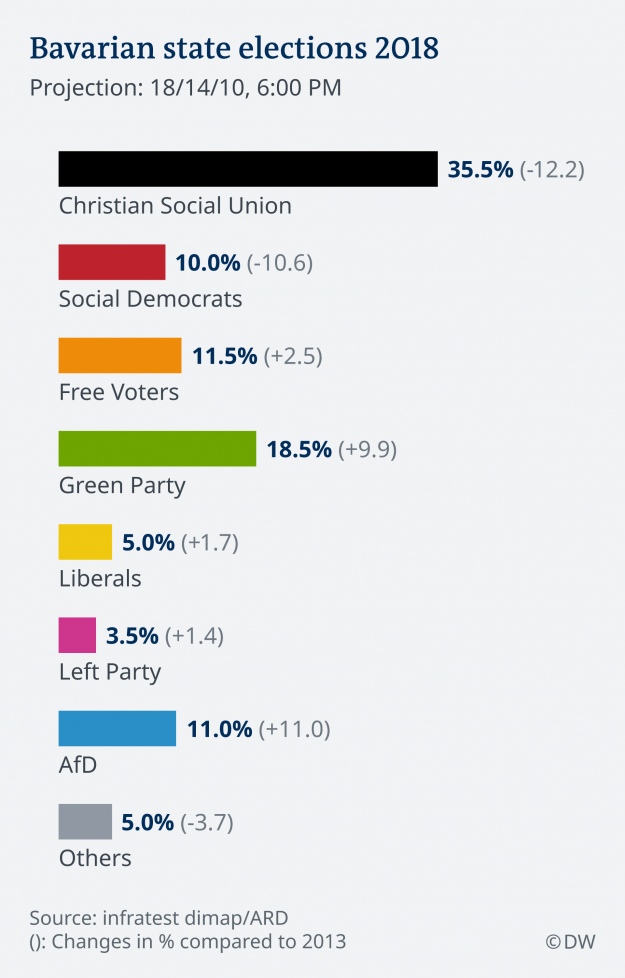 Главе МВД Германии и лидеру партии Хорсту Зеегоферу теперь придется объединяться с другими силами для создания коалиции. Это лишь третий подобный случай в послевоенной истории Баварии. Второе место на выборах заняли "Зеленые" - 18,5% голосов. Вслед за ними финишировали "Свободные избиратели" с 11,5% и правая "Альтернатива для Германии" - 11%.