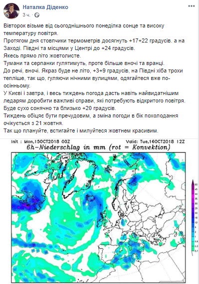 "В Киеве и завтра, и всю неделю погода даст даже выдающимся лодырям доработать важные дела, требующие открытого воздуха. Будет сухо солнечно и около 20 градусов. Неделя обещает быть великолепной, а изменение погоды в сторону похолодания ожидается с 21 октября", - обещает Наталья Диденко.