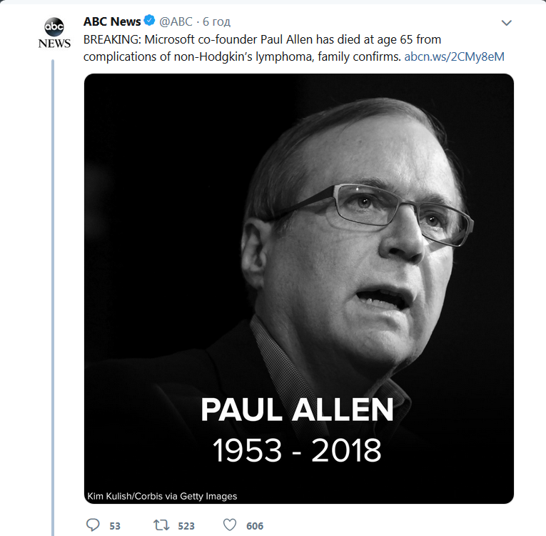 Билл Гейтс уже выступил с официальным соболезнованием, передает телеканал ABC News в своем Twitter.