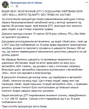 Отмечается, что прокуратура ходатайствовала о безальтернативном заключении подследственного под стражу. В сообщении напоминается, что ДТП произошло 13 октября 2018 вблизи ТРЦ Sky Mall на проспекте Шухевича.