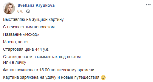 Заместитель главного редактора "Страны" Светлана Крюкова 16 октября выставила на аукцион новую картину. Полотно "Исход" (холст, масло), стартовая цена которого составляла 444 у.е., ушла с молотка за $5500.