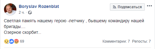 Через несколько часов стало известно, что один из погибших - командир бригады в Озерном Житомирского района. Об этом на своей странице в Facebook сообщил нардеп Борислав Розенблат.
