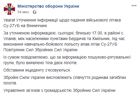 Су-27, принадлежащий ВСУ, упал около 17:00 во время учебно-боевого полета в районе села Уланив в Винницкой области (между населенными пунктами Бердичев и Хмельник). В Минобороны сообщили, что в результате крушения погибли два пилота.