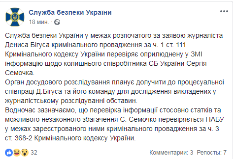 В СБУ все же начали проверку опубликованной в СМИ информации в отношении первого замглавы Службы внешней разведки, а ранее руководителя контрразведки СБУ Сергея Семочко. Она выполняется в рамках начатого по заявлению журналиста Дениса Бигуса уголовного производства по ч.1 ст.111 Уголовного кодекса Украины (госизмена).