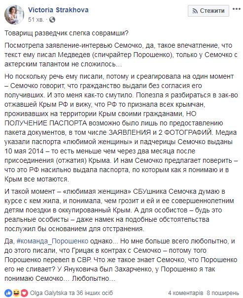 "Товарищ разведчик слегка соврамши? Посмотрела заявление-интервью Семочко, да, такое впечатление, что текст ему писал Медведев (спичрайтер Порошенко), только у Семочко с актерским талантом не сложилось…