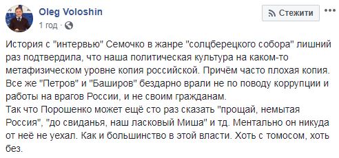 "История с "интервью" Семочко в жанре "солсберецкого собора" лишний раз подтвердила, что наша политическая культура на каком-то метафизическом уровне копия российской. Причём часто плохая копия. Все же "Петров" и "Баширов" бездарно врали не по поводу коррупции и работы на врагов России, и не своим гражданам.