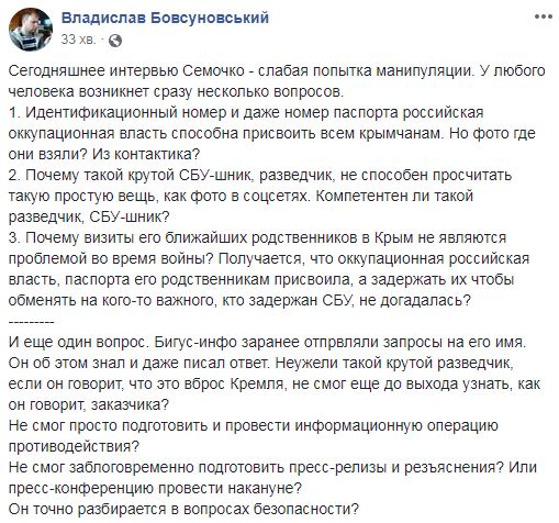 3. Почему визиты его ближайших родственников в Крым, не являются проблемой во время войны? Получается, что оккупационная российская власть, паспорта его родственникам присвоила, а задержать их чтобы обменять на кого-то важного, кто задержан СБУ, не догадалась?" – размышляет Бовсуновский.