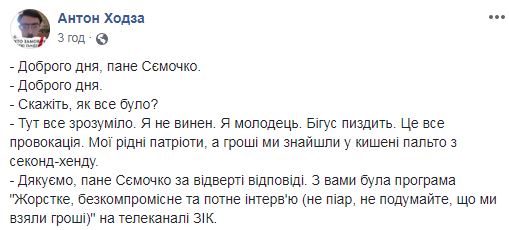 Многие же традиционно с юмором и иронией отнеслись к всему происходящему. Так, блогер Антон Ходза высмеял мягкотелость журналиста, общавшегося с Семочко:
