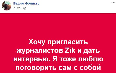 "Хочу пригласить журналистов ZIK и дать интервью. Я тоже люблю поговорить сам с собой" – пишет журналист Вадим Фолькер.