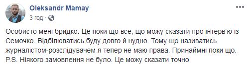 "Лично мне противно. Это пока все, что могу сказать об интервью с Семочко. Отбеливаться буду долго и нудно. Потому что называться журналистом-расследователем  я теперь не имею права. По крайней мере пока. P.S. Никакого заказа не было. Это могу сказать точно", - резюмировал Мамай.