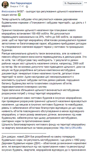 "При планировании нового микрорайона показатели плотности населения в крупных и крупнейших городах предполагается повышать не более чем на 20%, то есть до 540 человек/га, по отдельным условиям: чтобы на территории микрорайона обязательно размещались подземные автостоянки или многоэтажные гаражи, встроенно-пристроенные детсады и создавались озелененные открытые террасы в жилых и общественных зданиях ", - написал Парцхаладзе.