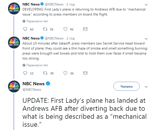 Самолет первой леди США Мелании Трамп вернулся на авиабазу морской авиации Эндрюс в штате Мэриленд. Во время полета у него возникли технические неполадки и задымление. Об этом в среду, 17 октября, передает NBC в твиттер.