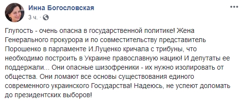 "Глупость - очень опасна в государственной политике! Жена Генерального прокурора и по совместительству представитель Порошенко в парламенте И.Луценко кричала с трибуны, что необходимо построить в Украине православную нацию! И депутаты ее поддержали... Они опасные шизофреники - их нужно изолировать от общества. Они ломают все основы существования единого современного украинского Государства! Надеюсь, не успеют доломать до президентских выборов!"