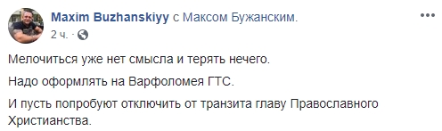Блогер Макс Бужанский иронизирует: "Мелочиться уже нет смысла и терять нечего. Надо оформлять на Варфоломея ГТС (газотранспортную систему - ред.). И пусть попробуют отключить от транзита главу Православного Христианства".