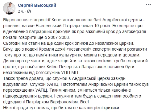 "Восстановление ставропигии Константинополя на базе Андреевской церкви - решение, которое Вселенский Патриарх ждал 10 лет. Потому что впервые о восстановлении патриарших приходов как о важном шаге к автокефалии начали говорить еще в 2007-2008. Сегодня мы стали еще на один шаг ближе к независимой церкви.