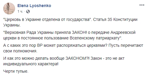 "Верховная Рада Украины приняла ЗАКОН! о передаче Андреевской церкви в постоянное пользование Вселенскому патриархату". А с каких это пор ВР может распоряжаться церквями? Пусть перечитают свои полномочия. И как это можно делать вообще ЗАКОНОМ?! Закон - это не акт индивидуального характера!"