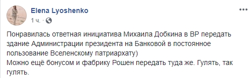 Она также поддерживает идею вместо Андреевской церкви подарить патриарху фабрику президента: "Понравилась ответная инициатива Михаила Добкина в ВР передать здание Администрации президента на Банковой в постоянное пользование Вселенскому патриархату. Можно ещё бонусом и фабрику Рошен передать туда же. Гулять, так гулять".