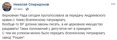Политический эксперт Николай Спиридонов пишет о том, что у парламента нет прав отдавать кому-либо храмы: "Верховная Рада сегодня проголосовала за передачу Андреевского храма (г. Киев) Вселенскому патриархату.