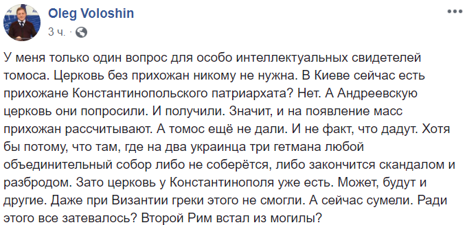 "У меня только один вопрос для особо интеллектуальных свидетелей томоса. Церковь без прихожан никому не нужна. В Киеве сейчас есть прихожане Константинопольского патриархата? Нет. А Андреевскую церковь они попросили. И получили. Значит, и на появление масс прихожан рассчитывают. А томос ещё не дали. И не факт, что дадут. Хотя бы потому, что там, где на два украинца три гетмана любой объединительный собор либо не соберётся, либо закончится скандалом и разбродом. Зато церковь у Константинополя уже есть. Может, будут и другие. Даже при Византии греки этого не смогли. А сейчас сумели. Ради этого все затевалось? Второй Рим встал из могилы?".