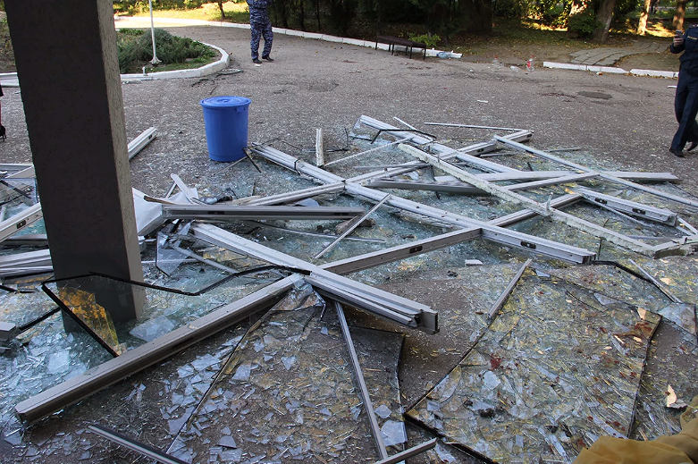 Серьезный ремонт потребуется везде: в фойе отсутствуют стекла, повалены вазоны. На полу, стенах - следы крови.