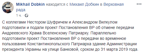 "С коллегами Нестором Шуфричем и Александром Вилкулом подготовили и подали проект Постановления ВР об отмене передачи Андреевского Храма Вселенскому Патриарху. Параллельно подготовили проект Постановления ВР о передачи во временное пользование Константинопольского Патриарха здание Администрации президента Украины на улице Банковой, сроком до 31 марта 2019 года", - написал Добкин.