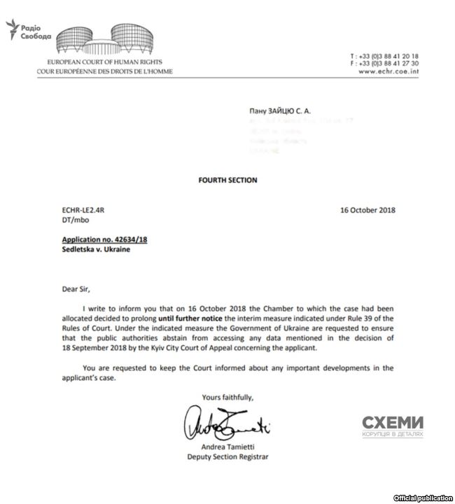 Европейский суд по правам человека в соответствии с Правилаом 39 своего Регламента продлил действие неотложных временных обеспечительных мер по делу журналистки Радио Свобода, главного редактора программы "Схемы: коррупция в деталях" Натальи Седлецкой. Также суд присудил правительству Украины "обеспечить воздержание органов власти от доступа к любым данным, приведенным в решении Апелляционного суда Киева от 18 сентября 2018". Об этом говорится в официальном письме из ЕСПЧ, поступившего из Страсбурга в адрес редакции Радио Свобода 17 октября.