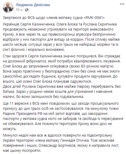 "Украинцев Сергея Калиниченко, Олега Блока и Руслана Скрипника продолжают незаконно удерживать на территории аннексированного Крыма. А все потому, что правоохранители агрессора беспричинно отобрали у них паспорта для выезда за границу. По истечении почти шести месяцев положение сейчас у всех троих не наилучшее: моряки и их семьи физически и морально истощены", - указала Денисова.