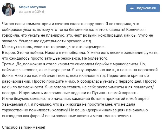 Студентка из Барнаула Мария Мотузная, которую обвиняли в экстремизме за картинки в соцсетях, объяснила свой отъезд из России в Украину желанием "нормально жить, а не как на пороховой бочке", однако оставаться в Украине не будет. Об этом она написала в соцсетях.
