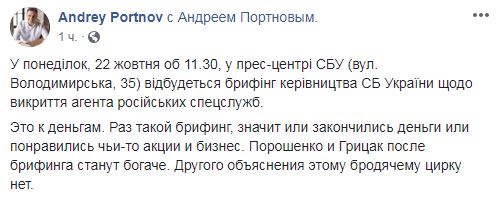 Известный юрист Андрей Портнов считает, что такие "акции" связаны с деньгами. "Это к деньгам. Раз такой брифинг, значит или закончились деньги или понравились чьи-то акции и бизнес. Порошенко и Грицак после брифинга станут богаче. Другого объяснения этому бродячему цирку нет", - написал Портнов в Facebook.