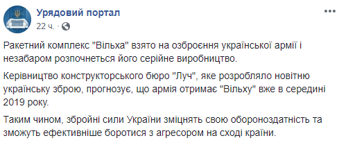 "Руководство конструкторского бюро "Луч", которое разрабатывало новое украинское оружие, прогнозирует, что армия получит "Ольху" уже в середине 2019 года. Таким образом, вооруженные силы Украины укрепят свою обороноспособность и смогут эффективно бороться с агрессором на востоке страны", - сказано в сообщении.