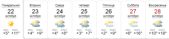 Сайт Gismeteо обещает солнечный понедельник с температурой до +11 днем. Во вторник температура снизится до +9 днем, возможен небольшой дождь. В среду и четверг днем до +6...+8, дождь. а вот выходные будут теплыми и сухими: до +16...+19.