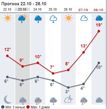 Ресурс Мeteoprog.ua дает похожий прогноз, но по данным этого ресурса самые холодные дни недели четверг и пятница, а среди недели будет идти дождь, но не обильный и без снега. На выходных +13...+19, пасмурно.