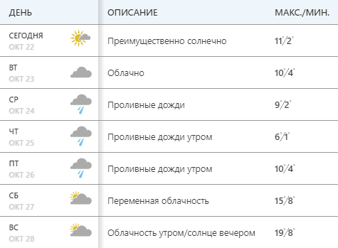 Сайт Weather.com обещает проливные дожди в среду, четверг и пятницу и снижение температуры до +6...+9. В субботу и воскресенье переменная облачность, до +15... +19.