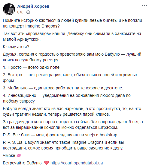 В Украине заработал новый сервис, который позволяет найти любое решение в базе суда. Он называется "Бабуля" и работает без регистрации и капч. Об этом написал создатель сервиса Андрей Хорсев на своей странице в Facebook.