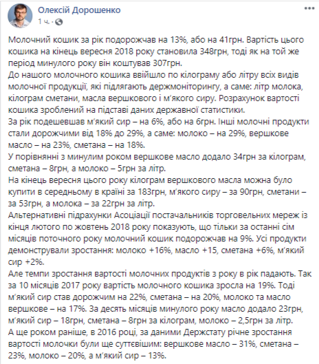 Он уточнил, что называет молочной корзиной перечень молочной продукции, подлежащий госмониторингу, а именно: литр молока, килограмм сметаны, сливочного масла и мягкого сыра. Стоимость этой корзины на конец сентября 2018 составляла 348 грн, тогда как на тот же период прошлого года она стоила 307 грн.