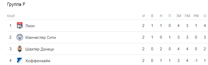 После второго тура в группе F лидировал Лион с 4 очками, второе место у МанСити - 3 очка, третье у Шахтера - 2 очка, последнюю строчку занимает Хоффенхайм - 1 очко.