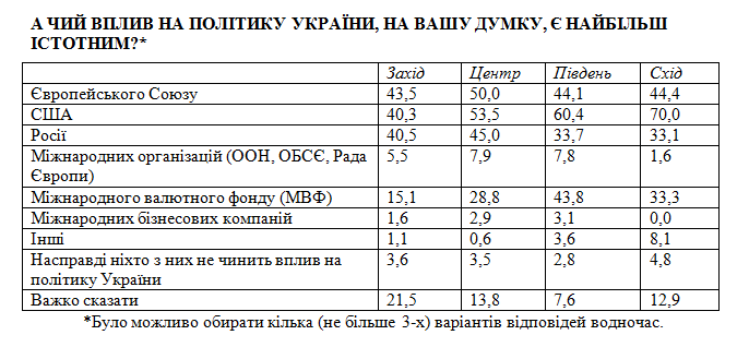 Влияние на Украину Евросоюза большинство опрошенных (55%) определили как положительное; негативным такое влияние считают 29%. В целом положительная оценка влияния на нашу страну со стороны США также преобладает над отрицательной (44% против 36%). Влияние России подавляющее большинство опрошенных (75%) охарактеризовало как негативное, и лишь 8% считают его полезным для Украины.