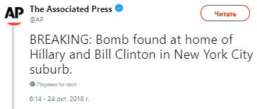 Как пишет The New York Times, в полиции рассказали, что бомбу нашел сотрудник, проверяющий почту, которая поступает Клинтонам. НО при этом не уточняется, где именно находилось взрывное устройство.