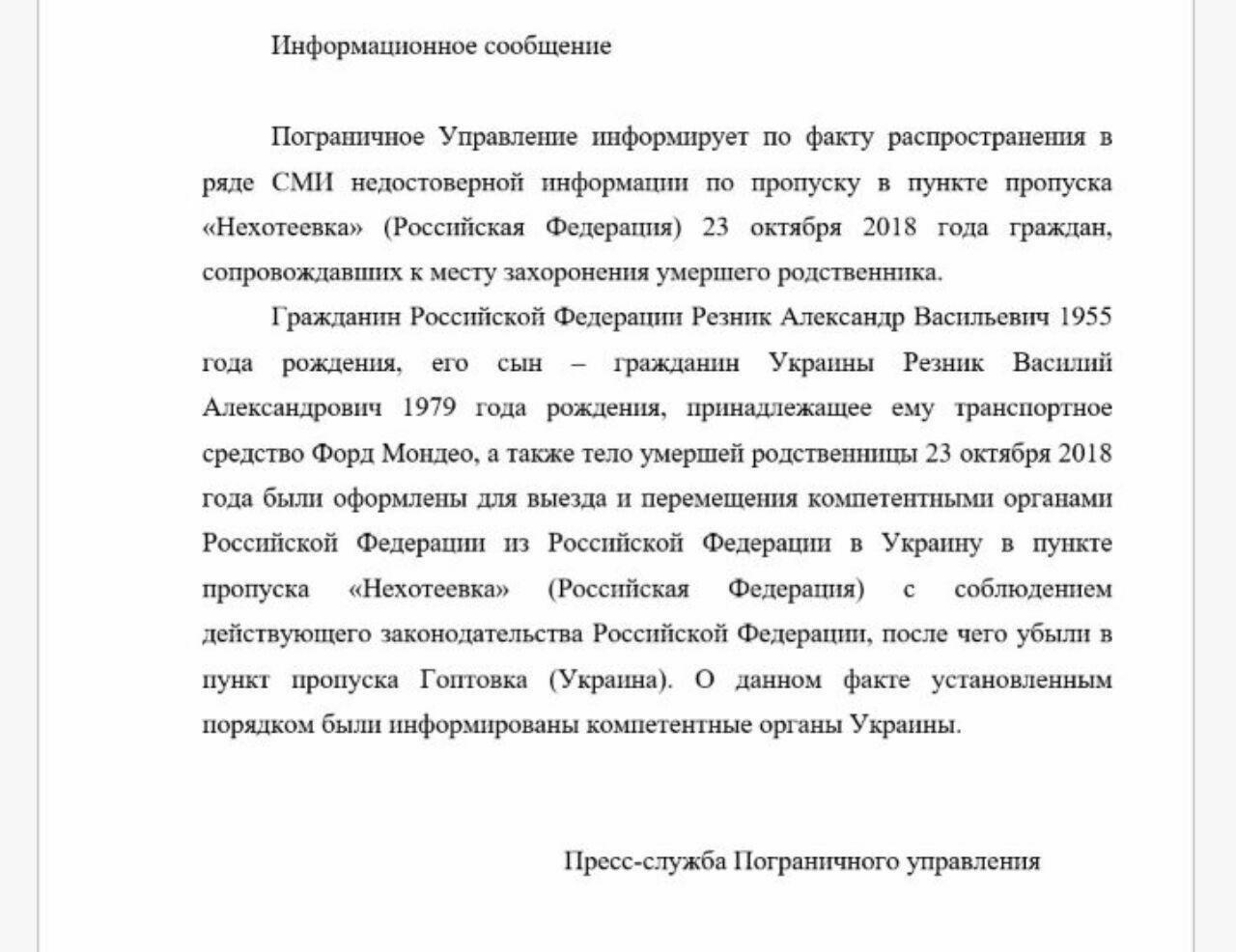 В управлении погранслужбы России сообщили, что гражданин РФ Александр Резник 1955 года рождения, его сын - гражданин Украины Василий Резник 1979 года рождения, принадлежащее ему транспортное средство Ford Mondeo, а также тело умершей родственницы 23 октября 2018 года были оформлены для выезда и перемещения компетентными органами Российской Федерации из России в Украину в пункте пропуска "Нехотеевка" с соблюдением действующего законодательства Российской Федерации.
