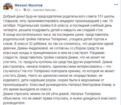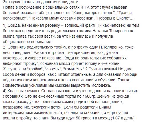 Так, председатель родительского комитета школы Михаил Мусатов на своей странице в Facebook так описывает инцидент: "Родительская тройка 6-Б класса, в последний учебный день четверти решила поздравить детей и накрыть им сладкий стол... В классе 32 ребенка, но так уж сложилось, что родители одной девочки, Дианы Андроновой, не согласны со сбором средств на классные нужды и принципиально в нем не участвуют. Раздавая сладости, представитель тройки Наталья Толяренко сказала Диане, что не может ее угостить, т.к. продукты куплены на средства других родителей. Диана расстроилась, начала плакать, одноклассники интересовались - что случилось? На что Толяренко повторила причину, по которой не может угостить Диану. Никто из одноклассников не злорадствовал, не издевался, дети сидевшие рядом, скорее были в недоумении от произошедшего. Классный руководитель Наталья Викторовна Комир, в это время выходила из класса".