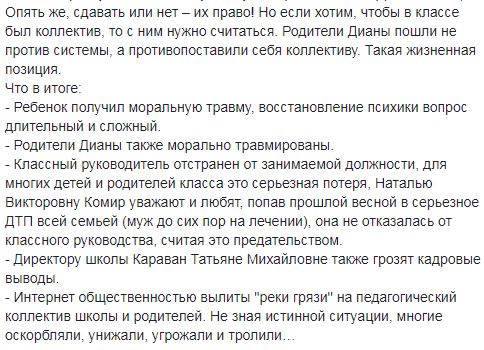По его словам, расходы на классные нужды согласовываются и утверждаются на родительских собраниях и идут на поощрение, поздравление, экскурсии детей. "Если бы родители Дианы интересовались жизнью класса, посещали собрания, а еще лучше вошли в тройку, то знали бы куда идут 50 гривен в месяц (1,67 в день). Опять же, сдавать или нет - их право! Но если хотим, чтобы в классе был коллектив, то с ним нужно считаться. Родители Дианы пошли не против системы, а противопоставили себя коллективу. Такая жизненная позиция", - заявляет Мусатов.